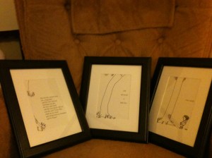 They are framed pages from the book, “The Giving Tree”. The nursery will have a tree theme. We have a huge tree decal that we haven’t put up yet. Once it’s up, I’ll show you. It’s pretty cool.